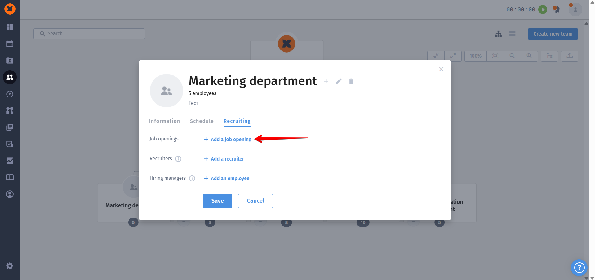 Open the additional team settings on the main company structure page and click "Add an employee."