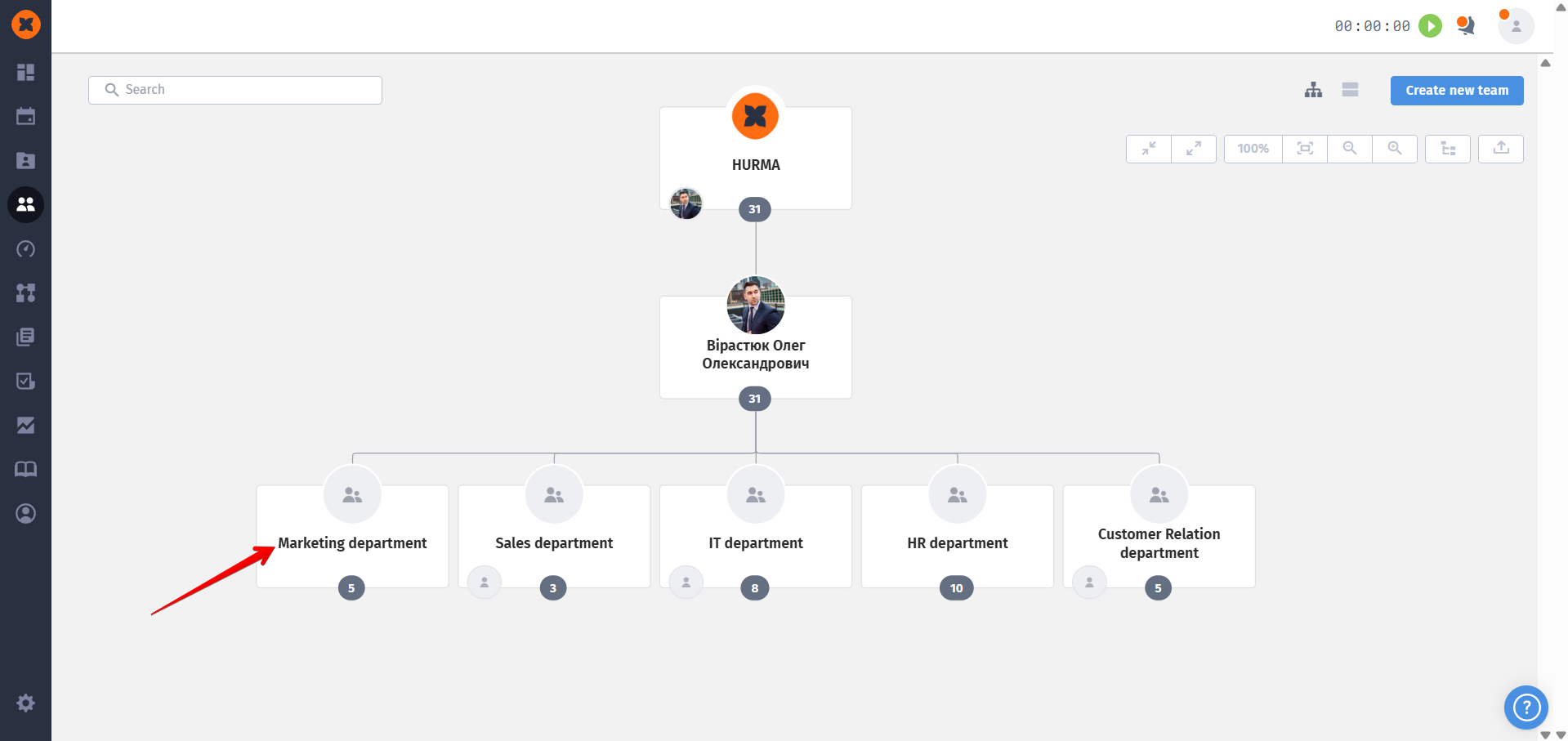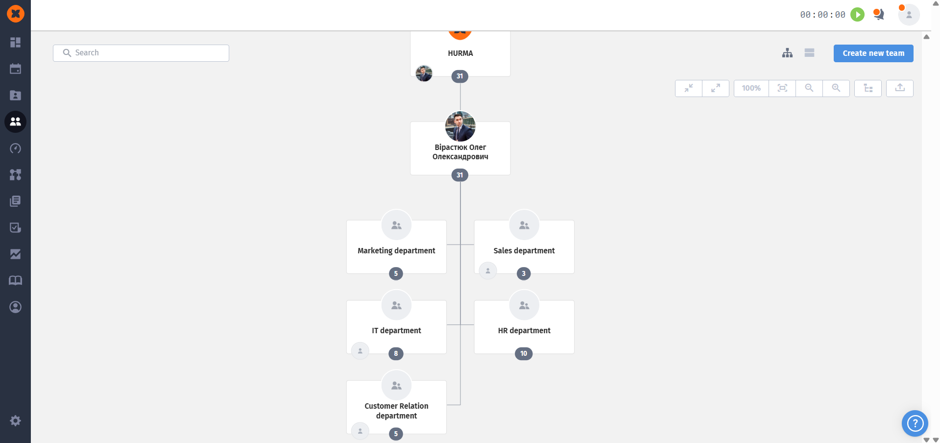 To create a new team in the company structure, click the "Create new team" button, provide information about the team, and click the "Save" button.