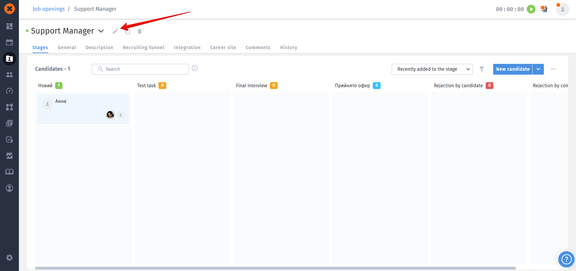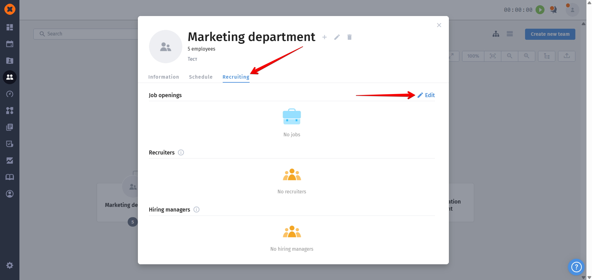 To add an existing job opening to a team, open the team tnformation page, go to the “Recruiting” section, switch to edit mode, and add the necessary job openings.