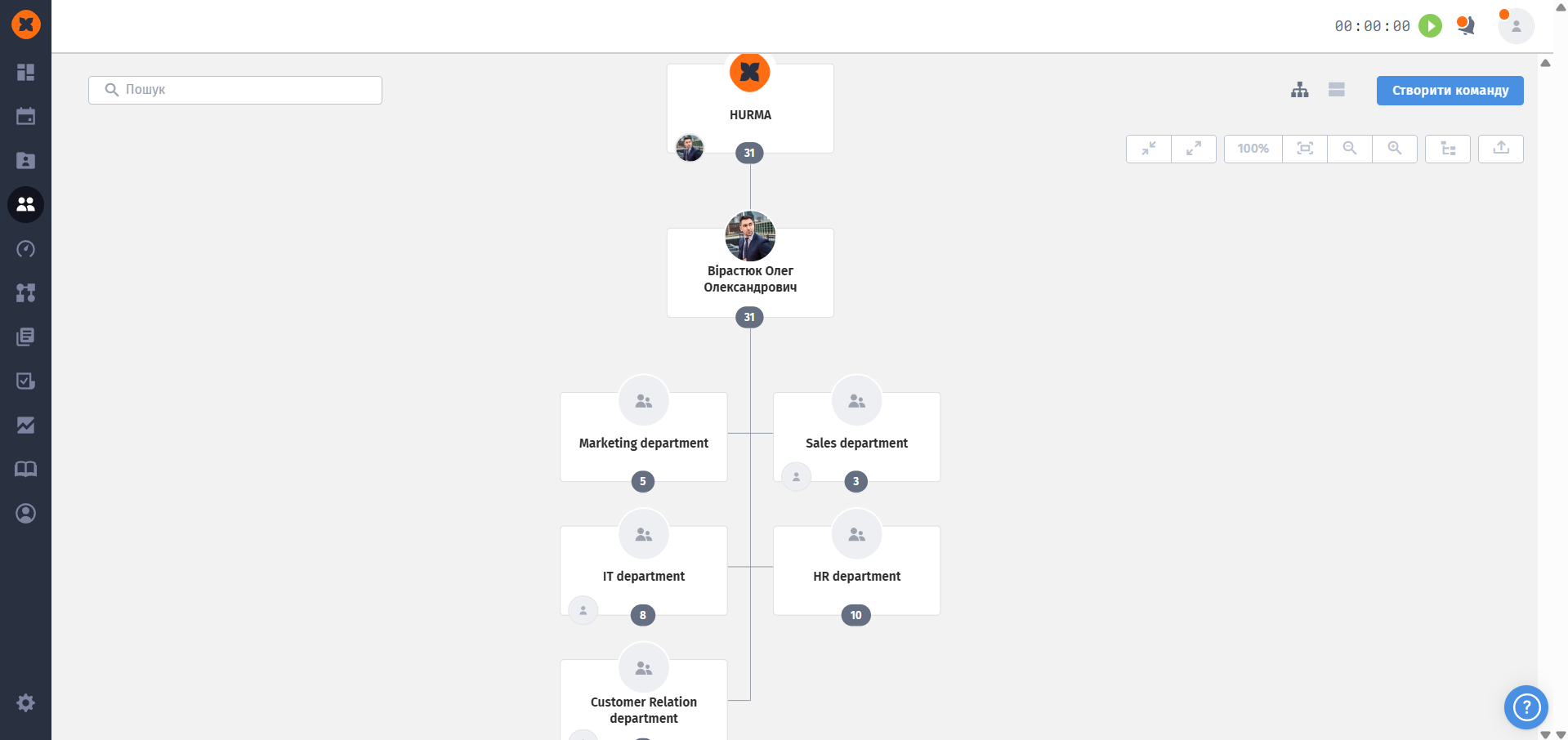Для створення нової команди в структурі компанії, натисніть кнопку «Створити команду», заповніть інформацію про команду та натисніть кнопку «Зберегти».