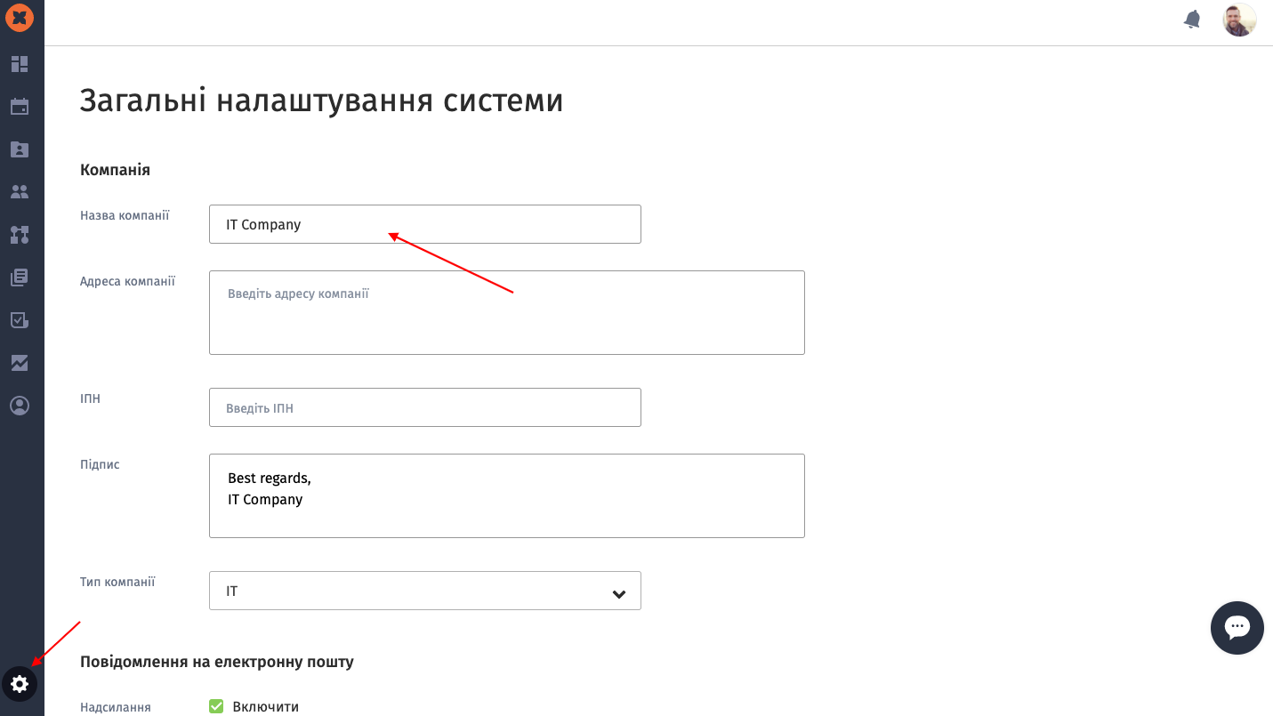 На початку налаштування структури, потрібно змінити назву компанії. Для цього, перейдіть у розділ «Налаштування» — «Загальні налаштування», вкажіть назву компанії в однойменному полі та натисніть кнопку «Зберегти». Після цього назву буде змінено як у розділі «Структура», так і в інших розділах системи.