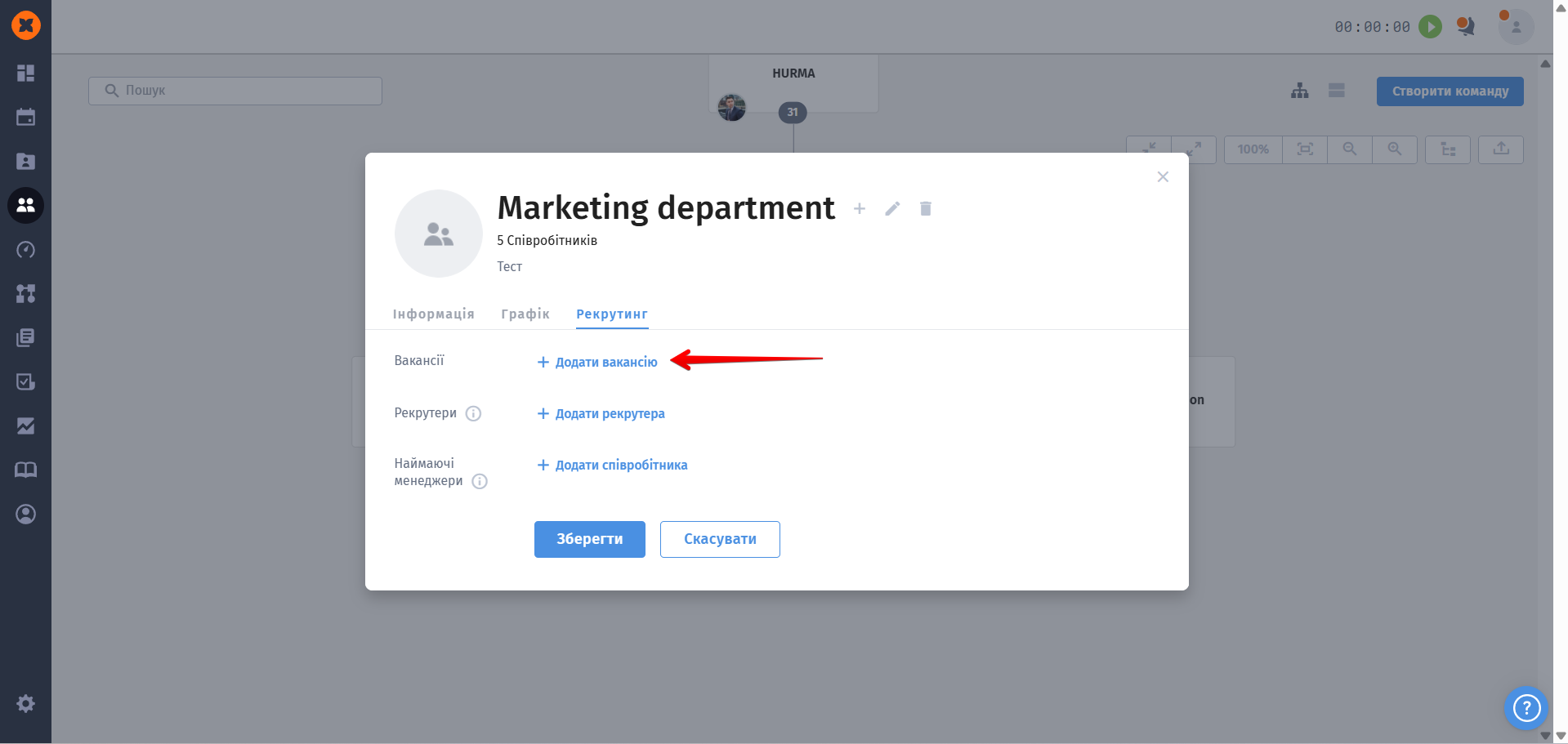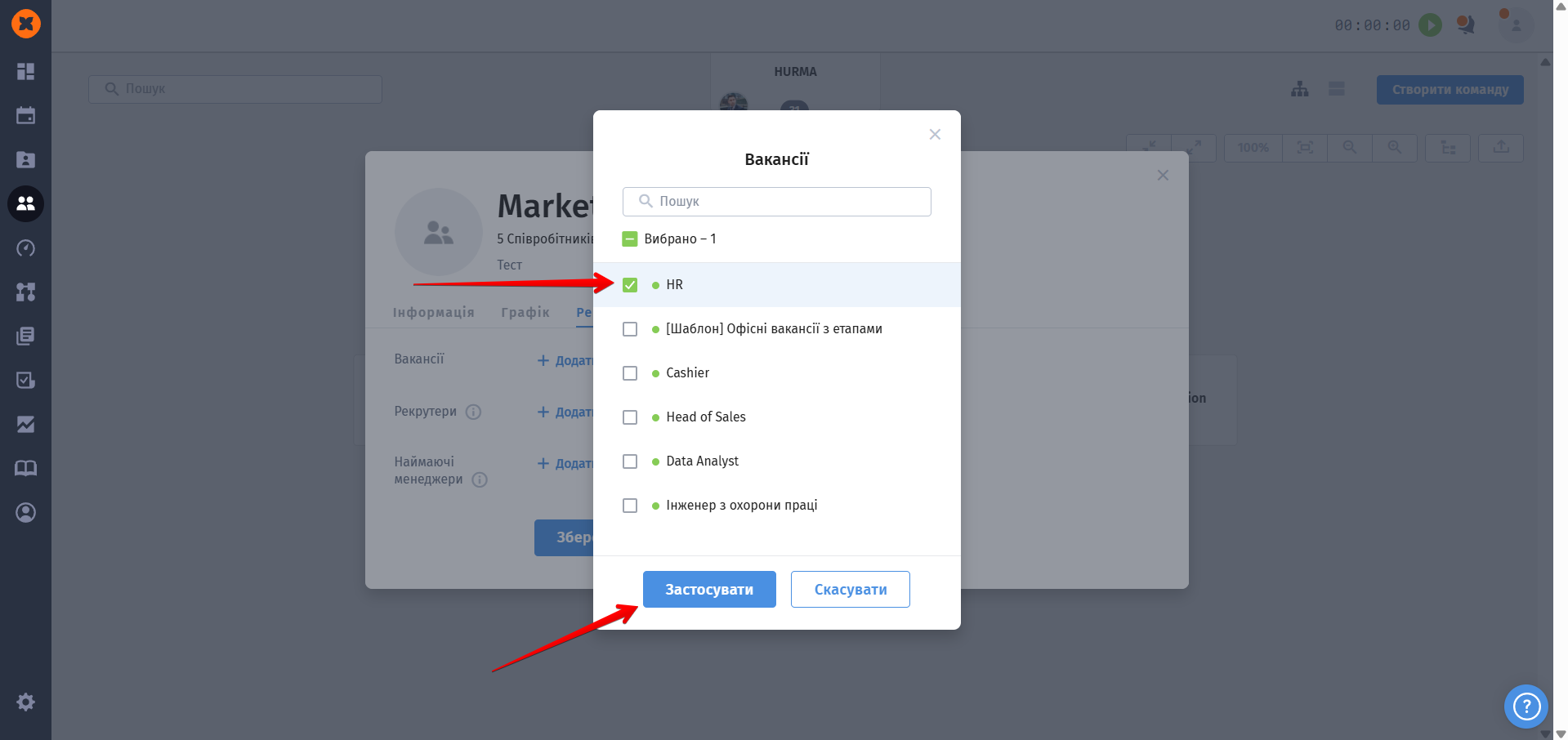 Для призначення відповідального HR або менеджера команди, натисніть кнопку «Додати HR» або «Додати Менеджера» відповідно.