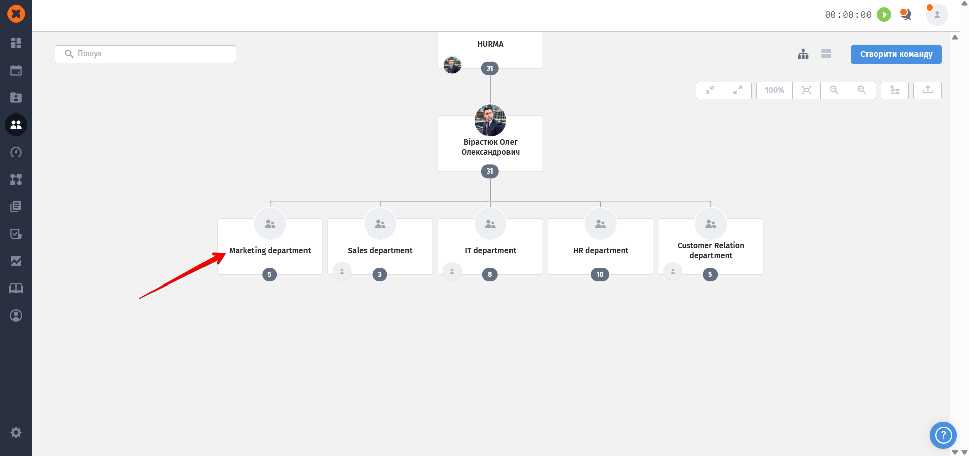 Для команди «З керівником» можна вибрати лише співробітника зі списку, при цьому його ім'я та фото буде відображено у структурі компанії як визначений напрямок (відділ), а також у інших розділах системи.