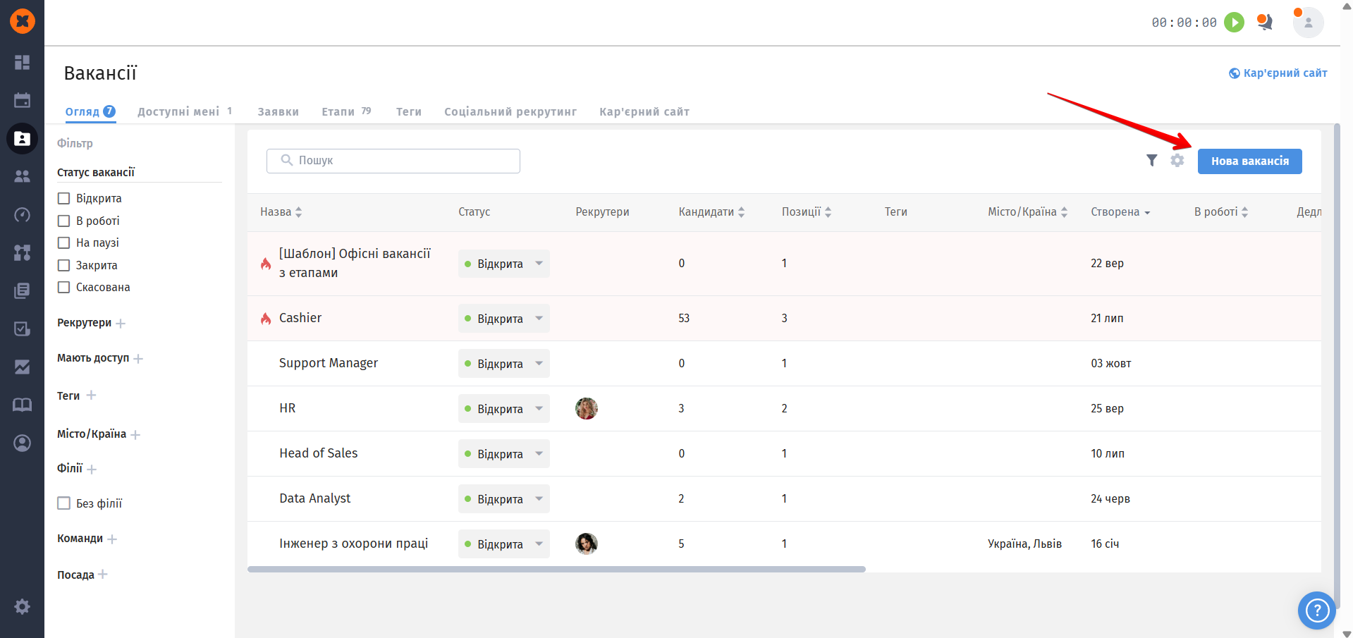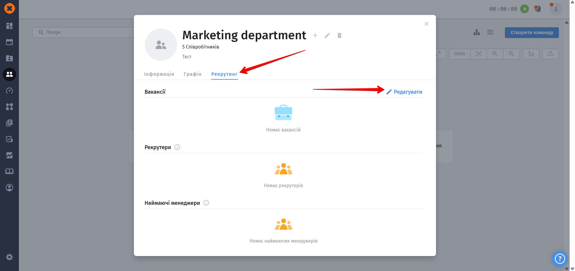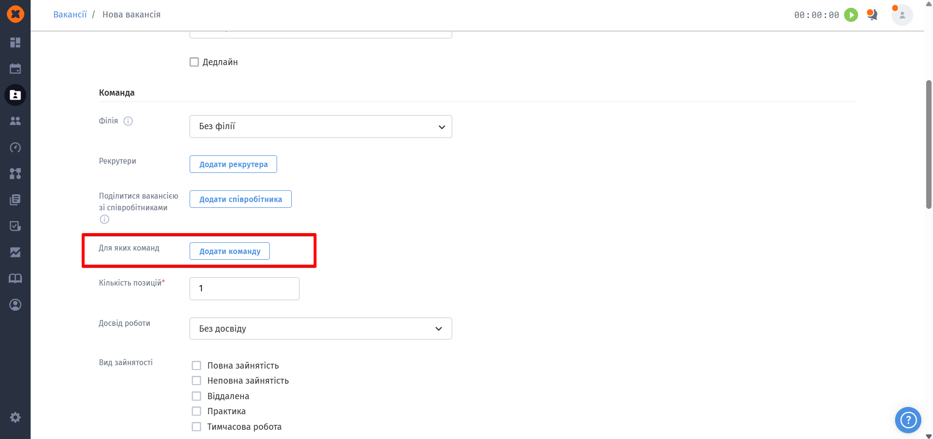 Щоб додати існуючу в системі вакансію в команду вам необхідно відкрити сторінку інформації про команду, перейти в розділ “Рекрутинг“, відкрити режим редагування та додати необхідні вакансії.