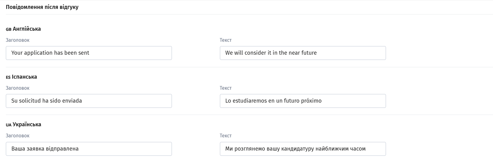 Багатомовність: налаштовуйте відповіді для міжнародних кандидатів (англійська, іспанська, українська).