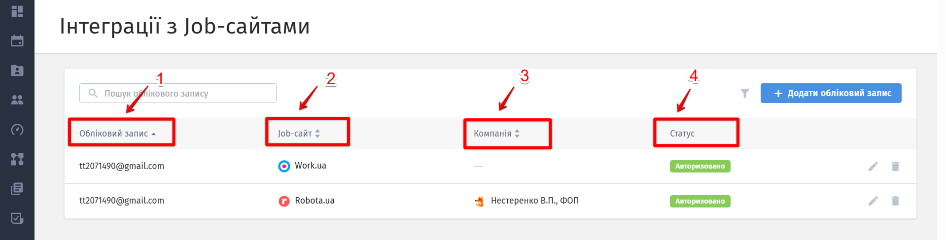 На сторінці відображаються всі підключені облікові записи поточного користувача. Дані представлені у вигляді таблиці з наступними колонками: