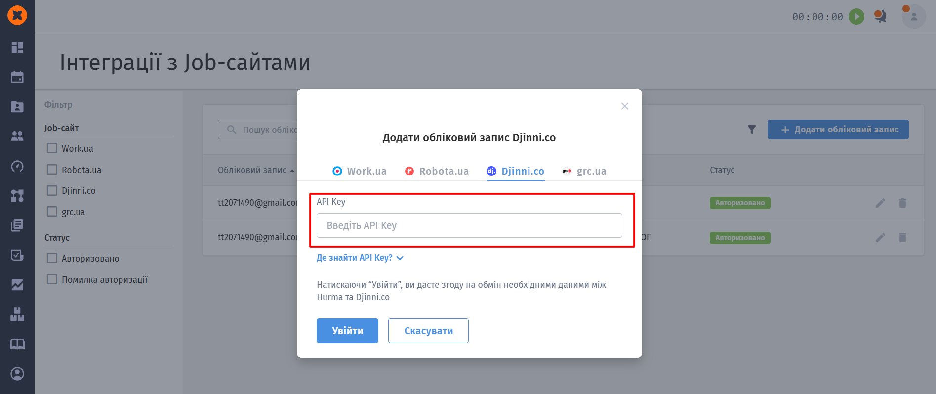 Підключення акаунту відбувається через ключ, який необхідно отримати на порталі Djinni, перейшовши в налаштування аккаунту - вкладка "API".