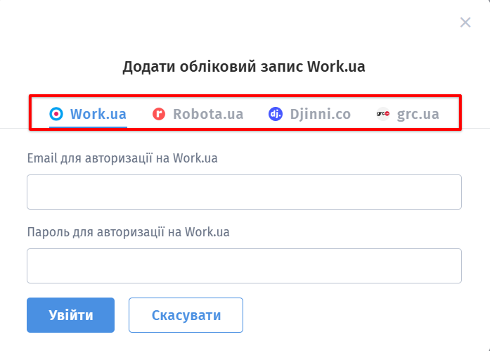 У вікні, що з’явиться, введіть логін/пароль від вашого кабінету роботодавця на відповідному ресурсі та натисніть кнопку “Увійти“.