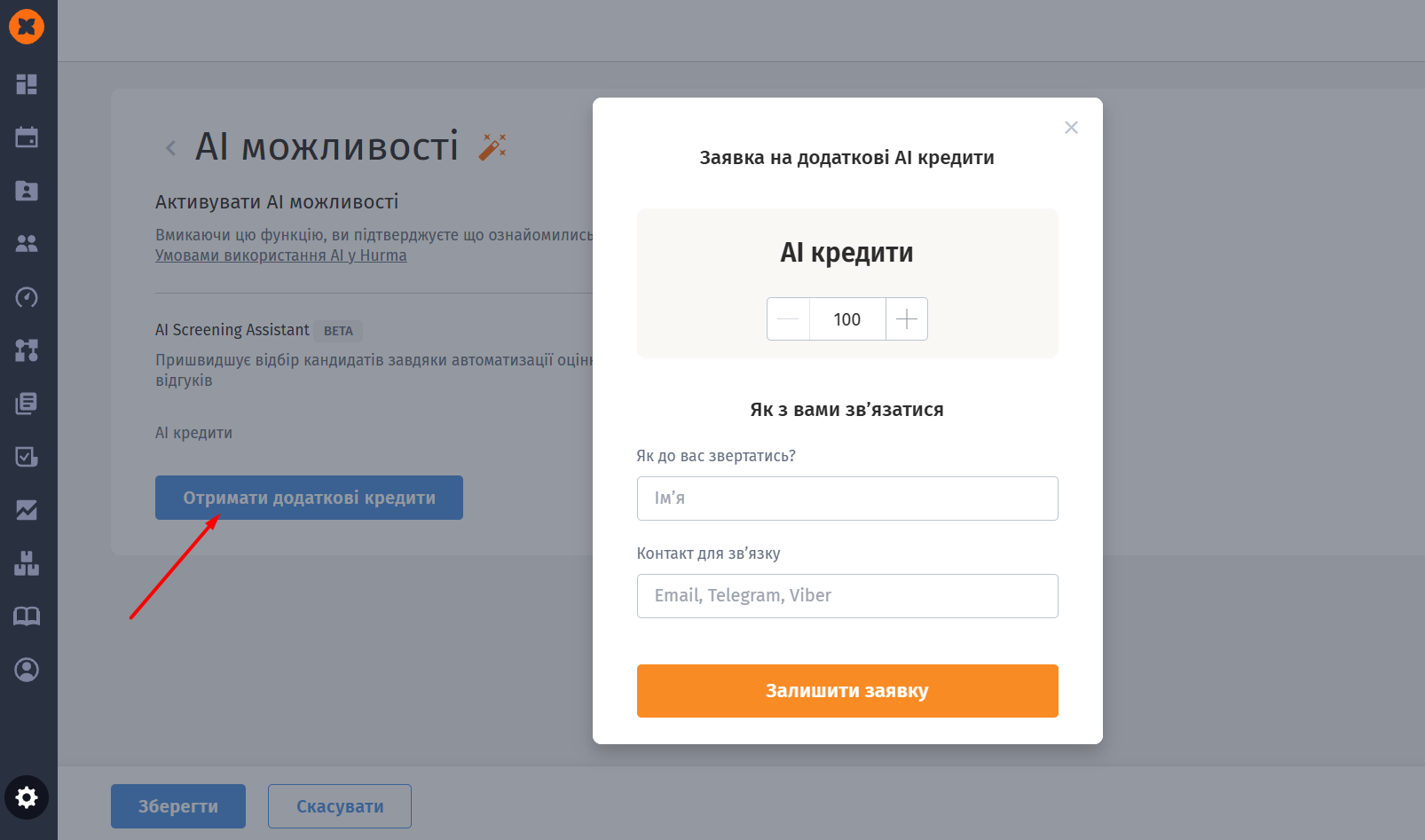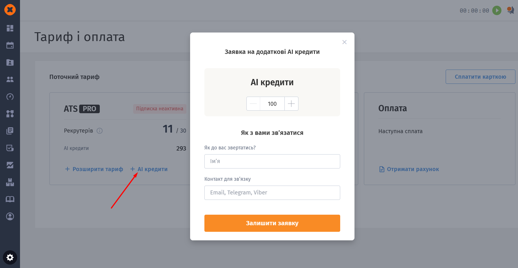 Поповнити баланс можна ви можете подавши запит через кнопку “Отримати додаткові кредити” безпосередньо на сторінці “Налаштування” - “AI можливості“ або на сторінці “Налаштування” - “Тариф і оплата”.