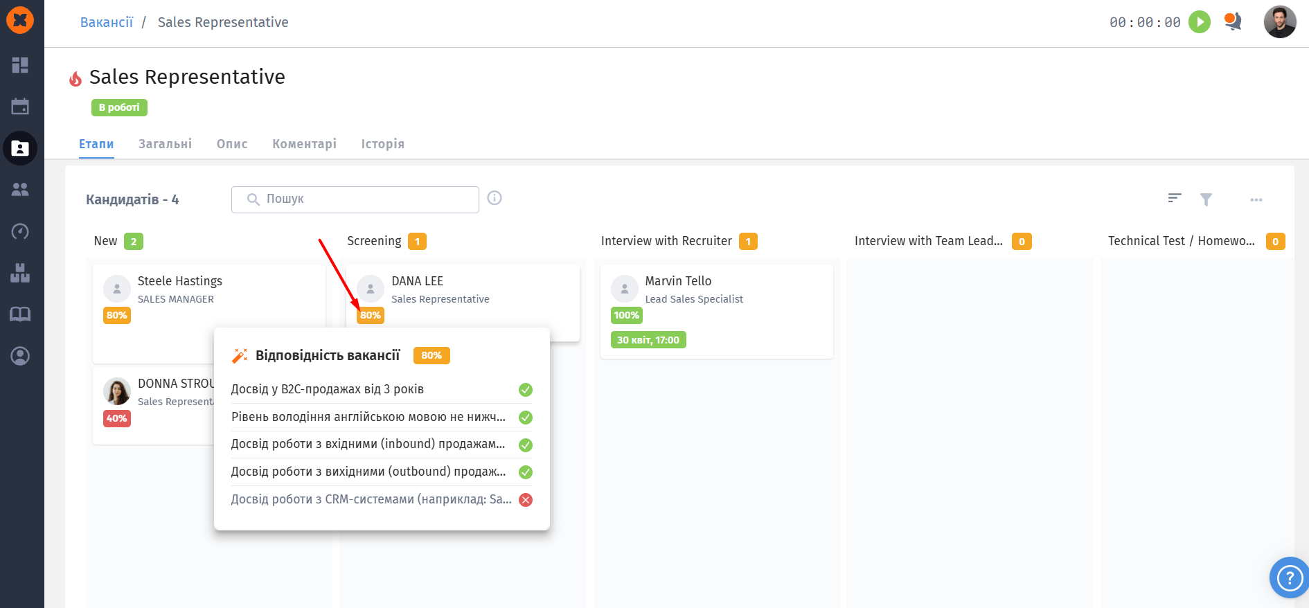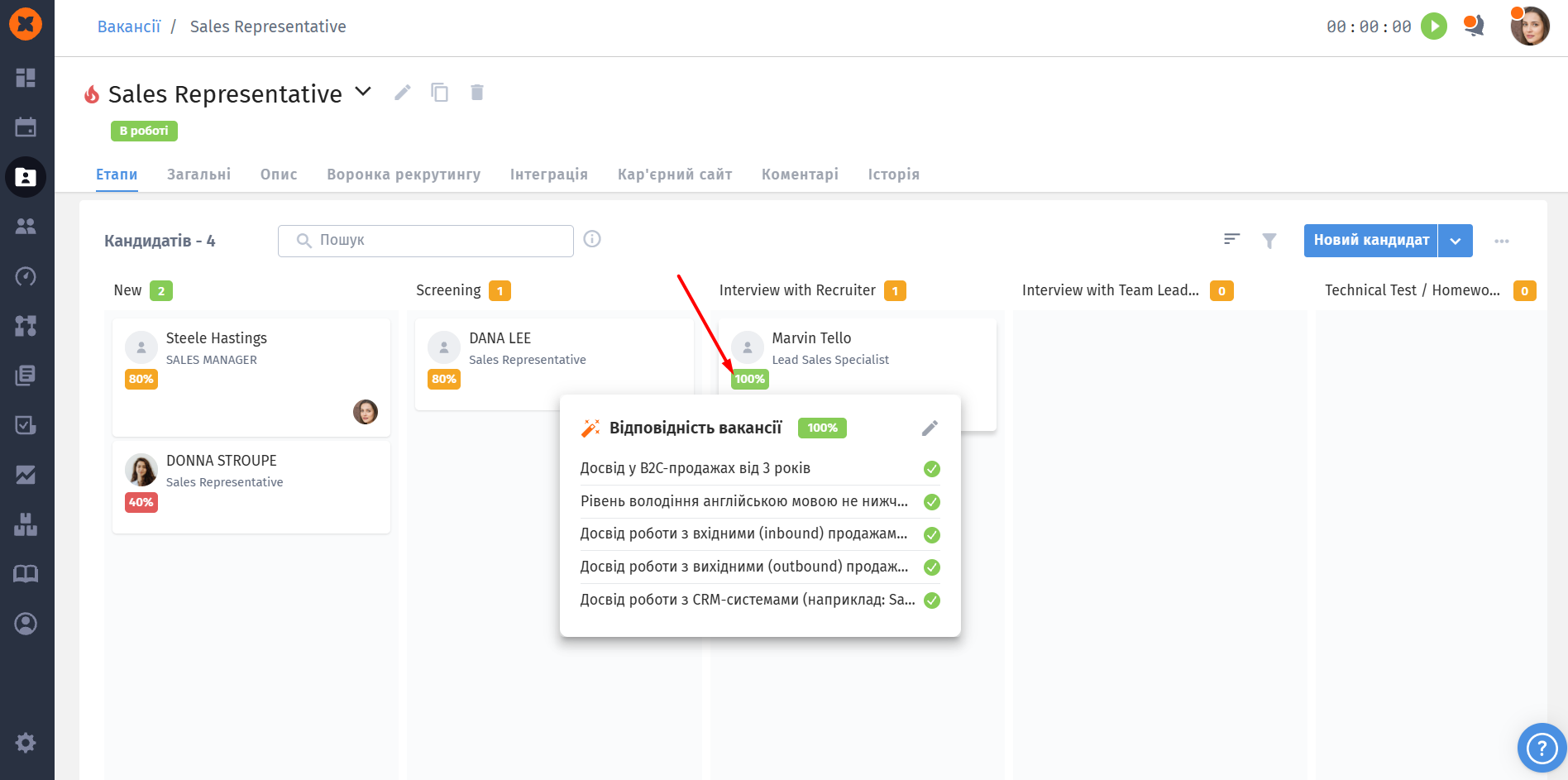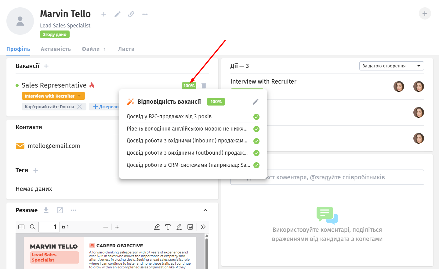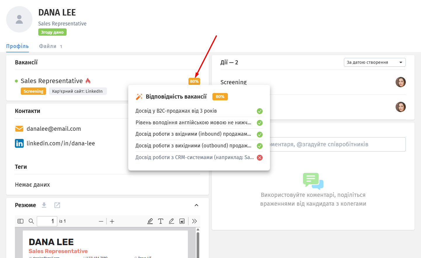 Оцінка базується на даних з профілю та резюме. Навівши курсор на оцінку, ви побачите інформацію: яким саме критеріям кандидат відповідає, а яким ні.