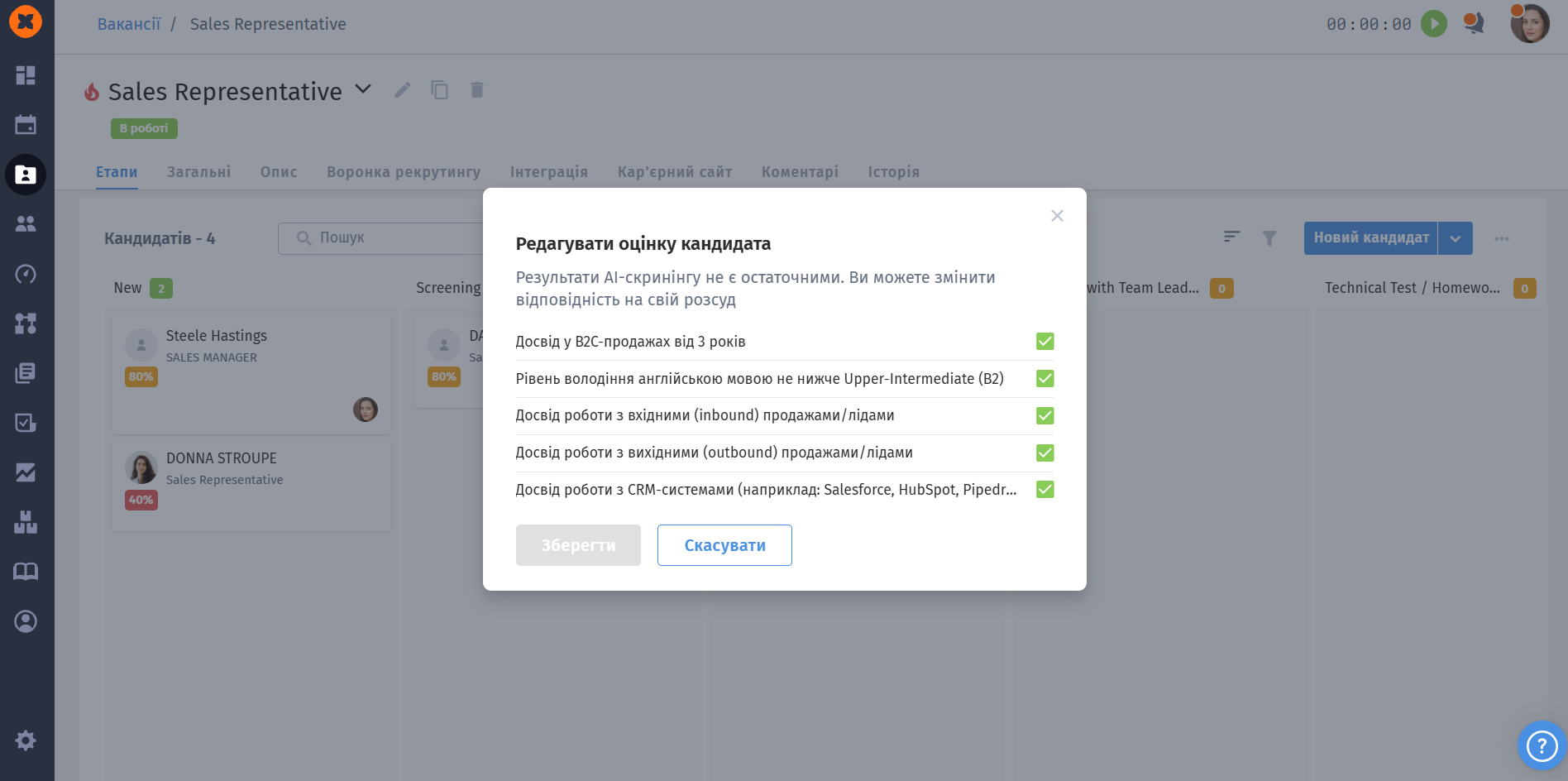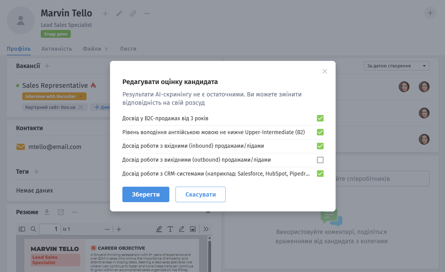 Рекрутери можуть редагувати результати вручну. Якщо на співбесіді з'ясувалася нова інформація, ви можете натиснути іконку редагування поруч з оцінкою та змінити відповідність - після цього загальний бал кандидата буде перераховано.