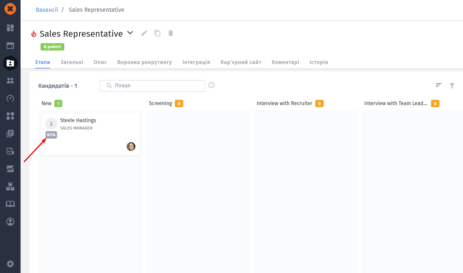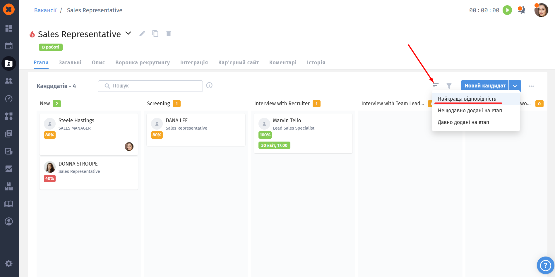 Коли на вакансії з'являються оцінені кандидати, стає доступним зручне сортування за “Найкращою відповідністю”.