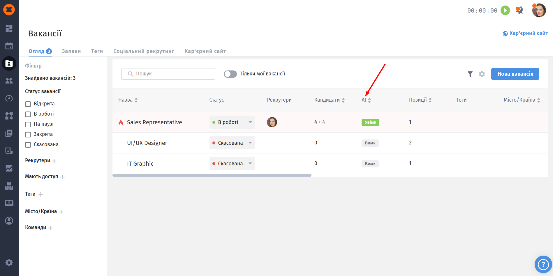 Після цього у загальному списку вакансій з'явиться стовпець “AI“, який відображатиме, увімкнено чи вимкнено оцінювання для конкретної вакансії.