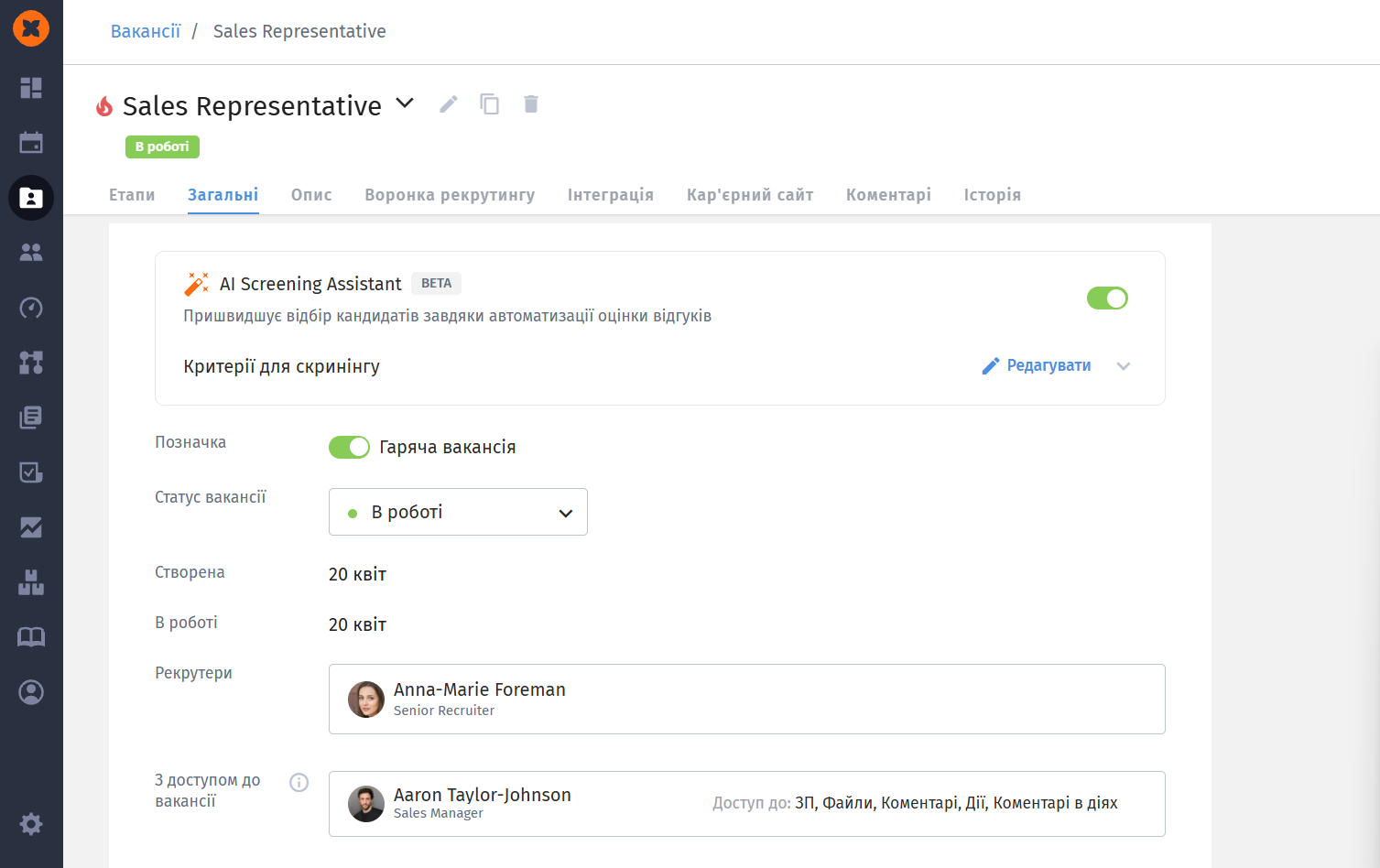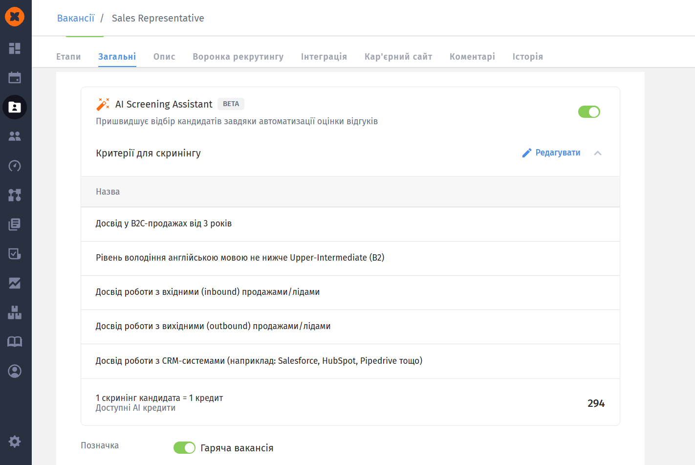 У вкладці “Загальні” в картці кожної вакансії з'явиться новий блок “AI Screening Assistant”, в якому можна вмикати/вимикати AI скринінг та редагувати критерії.