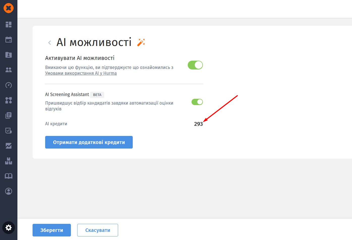Переглядати баланс AI кредитів ви можете на сторінці “Налаштування” - “AI можливості“.