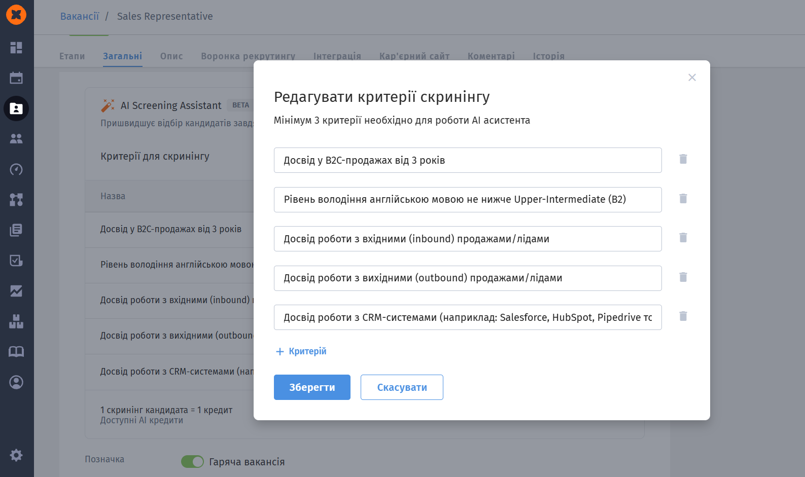 Після запуску функціоналу “AI Screening Assistant” критерії генеруються автоматично. Вони генеруються лише один раз на основі опису вашої вакансії, проте ви можете гнучко налаштовувати цей список в подальшому вручну: залишати згенеровані пункти, видаляти зайві або додавати свої (наприклад, вимогу щодо міста проживання).